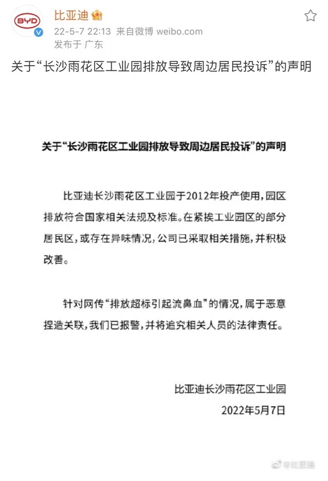 昨晚,比亚迪官方微博发布关于“长沙雨花区工业园排放导致周边居民投诉”的声明称,比亚迪长沙雨花区工业园于2012年投产使用,园区排放符合国家相关法规及标准。在紧挨工业园区的部分居民区,或存在异味情况,公司已采取相关措施,并积极改善。针对网传“排放超标引起流鼻血”的情况,比亚迪方面称这属于恶意捏造关联,该企业已报警,并将追究相关人员的法律责任。