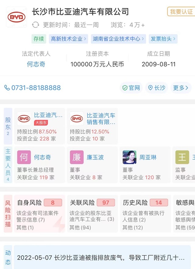 企查查的信息显示,长沙市比亚迪汽车有限公司(下称“长沙比亚迪”)成立于 2009 年,法定代表人为何志奇,注册资本为 10 亿元人民币。