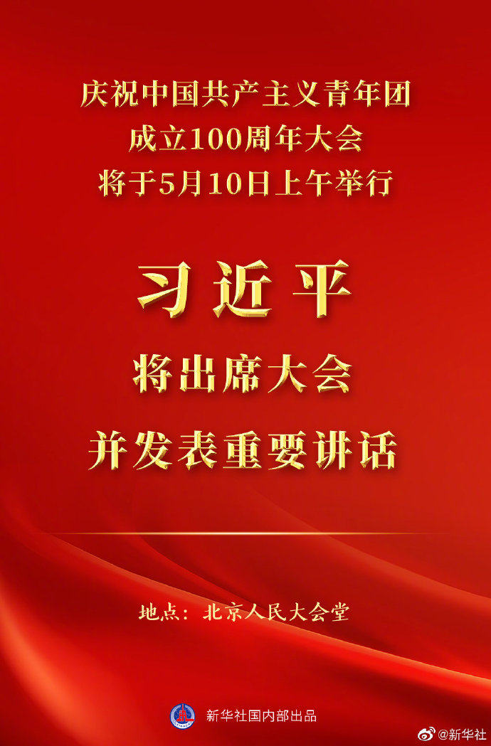 庆祝中国共产主义青年团成立100周年大会10日上午隆重举行,习近平将出席大会并发表重要讲话
