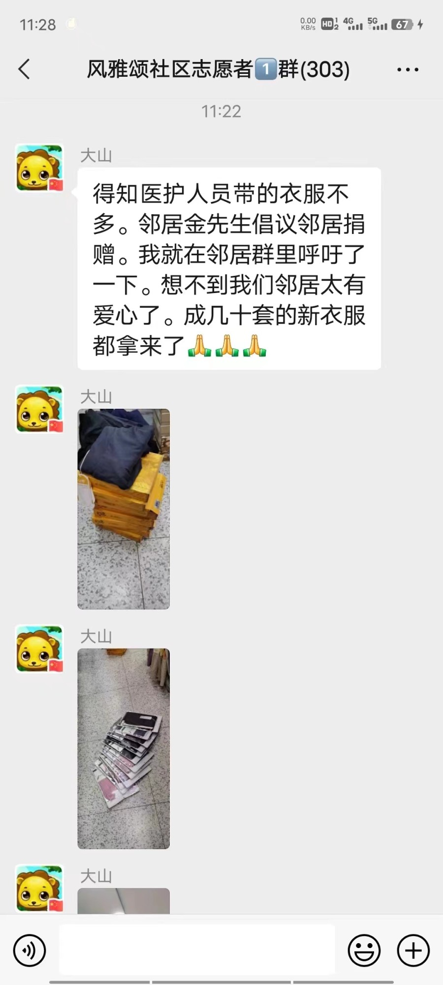 “@所有人,各位居民朋友们,因天气骤变,洛阳支援郑州的医生身着单薄的衣服,在寒冷的天气里坚守为咱们核酸采样,现急需衣物保暖。家中有干净衣物的请于社区联系,您的爱心将让支援的医护人员备感温暖。感恩感谢!”上午8点多,金水区风雅颂社区业主和志愿者群里,一条条捐衣信息迅速得到了业主和志愿者们的转发回应,一件件或干净或崭新的衣物汇聚到了社区办公室。