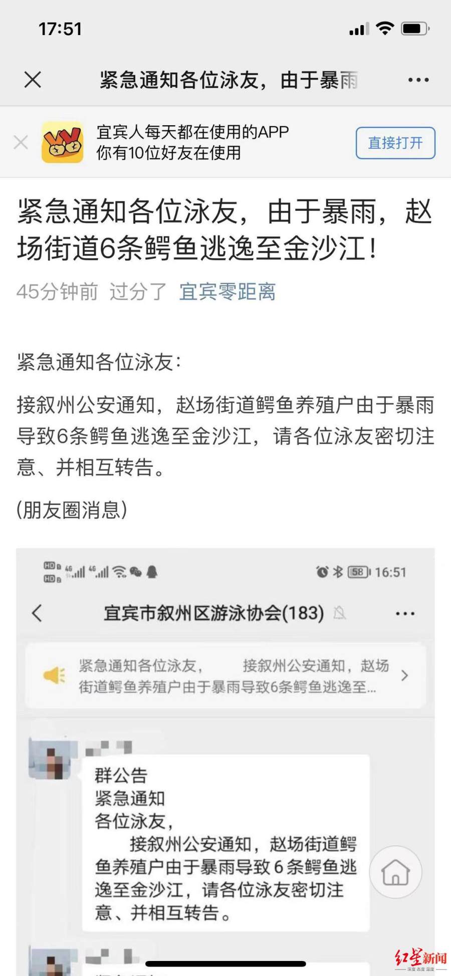 5月9日下午,宜宾市叙州区游泳协会发布群公告,紧急通知各位泳友:“赵场街道鳄鱼养殖户由于暴雨导致6条鳄鱼逃逸至金沙江,请各位泳友密切注意并相互转告。”红星新闻记者注意到,该紧急通知一连重复了3次;同样的通知内容在叙州区游泳协会常务理事、监事、队长群也进行了发布。
