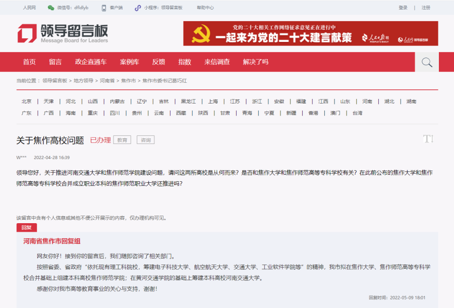 对此,河南省焦作市回复组于5月9日回复称,按照省委、省政府“依托现有理工科院校,筹建电子科技大学、航空航天大学、交通大学、工业软件学院等”的精神,我市拟在焦作大学、焦作师范高等专科学校合并基础上组建本科高校焦作师范学院;在黄河交通学院的基础上筹建本科高校河南交通大学。