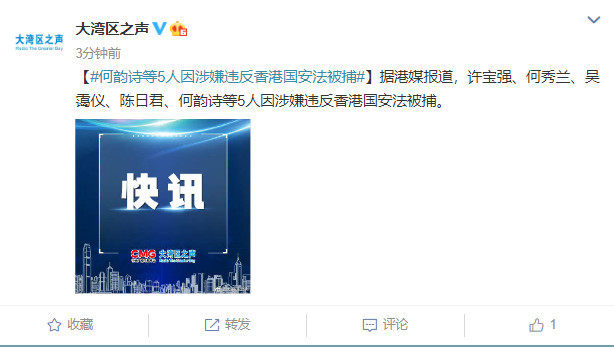 据港媒报道,许宝强、何秀兰、吴霭仪、陈日君、何韵诗等5人因涉嫌违反香港国安法被捕。