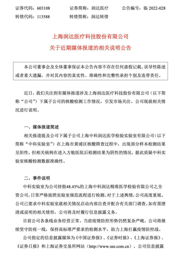 5月11日,润达医疗发布公告回应,表示注意到媒体报道提及中科实验室在上海市黄浦区核酸筛查过程中,出现部分样本检测结果呈阳性,但相关病例在进入方舱医院后检测结果为阴性的情况。