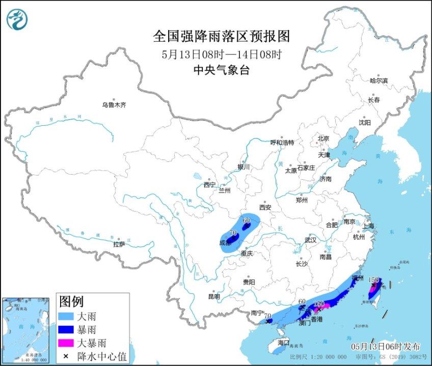 预计,5月13日08时至14日08时,广东中南部、广西东南部、福建东南部及陕西南部、四川盆地中北部、海南岛东南部、台湾岛大部等地部分地区有大到暴雨,其中,广东东南部沿海、台湾岛中北部等地部分地区有大暴雨(100~150毫米)。上述部分地区伴有短时强降水(最大小时降雨量20~50毫米,局地可超过60毫米),局地有雷暴大风等强对流天气。