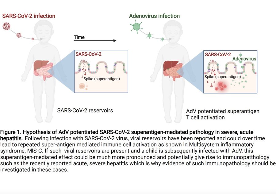 在感染新冠病毒后,病毒库可能会随着时间的推移导致反复的超级抗原介导的免疫细胞激活,如多系统炎症综合征(MIS-C)。如果存在此类病毒库,并且儿童随后感染了腺病毒(AdV),这种超抗原介导的影响可能会更加明显,并可能导致免疫异常,如最近报告的急性重度肝炎,这就是为什么在这些病例中应该调查这种免疫病理学的证据。