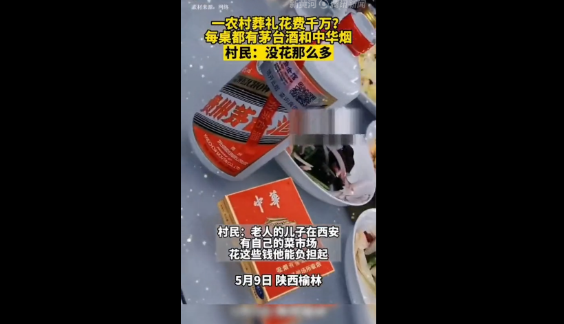5月10日,网传陕西省榆林市子洲县一农村葬礼花费高达千万元,吊唁者在宴席上喝的是飞天茅台酒。这究竟是咋回事?