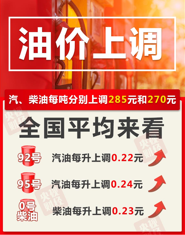 记者从国家发改委获悉,本次油价调整具体情况如下:国内汽、柴油价格每吨分别提高285元和270元。