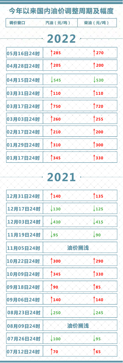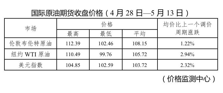 根据国家发改委消息,新一轮成品油调价窗口将于今天(5月16日)24时开启。据国家发改委价格监测中心监测,本轮成品油调价周期内(4月28日—5月13日)国际油价震荡上行,伦敦布伦特、纽约WTI平均油价比上轮调价周期上涨2.08%。