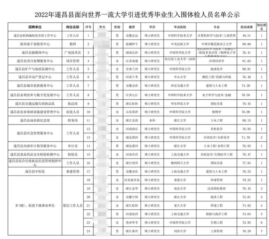 此前不久,浙江省丽水市遂昌县的《2022年遂昌县面向世界一流大学引进优秀毕业生入围体检人员公告》公示名单曾引发关注。名单显示,入围体检人员均来自浙江大学、中国科学技术大学、上海交通大学、复旦大学、同济大学等高校。