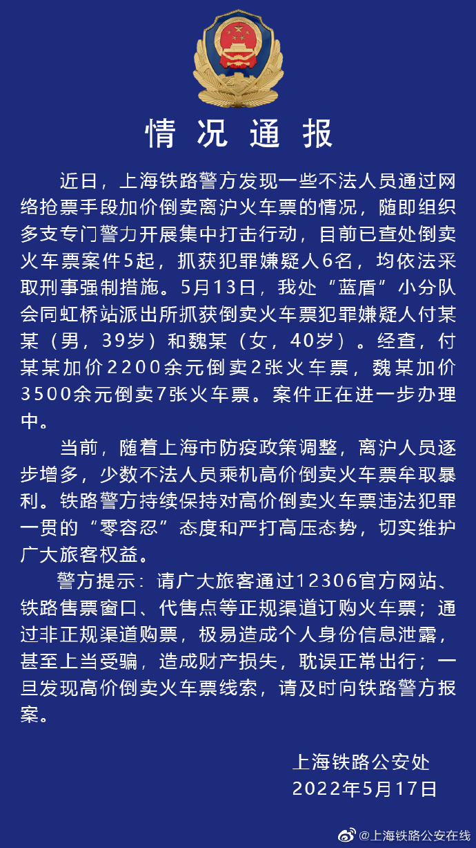 5月17日,上海铁路公安局上海公安处官方微博 @上海铁路公安在线 发布《情况通报》,如下:近日,上海铁路警方发现一些不法人员通过网络抢票手段加价倒卖离沪火车票的情况,随即组织多支专门警力开展集中打击行动,目前已查处倒卖火车票案件5起,抓获犯罪嫌疑人6名,均依法采取刑事强制措施。