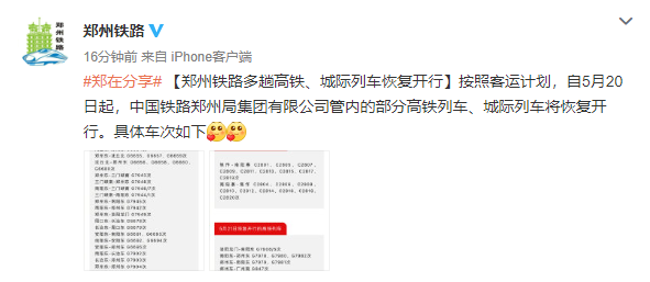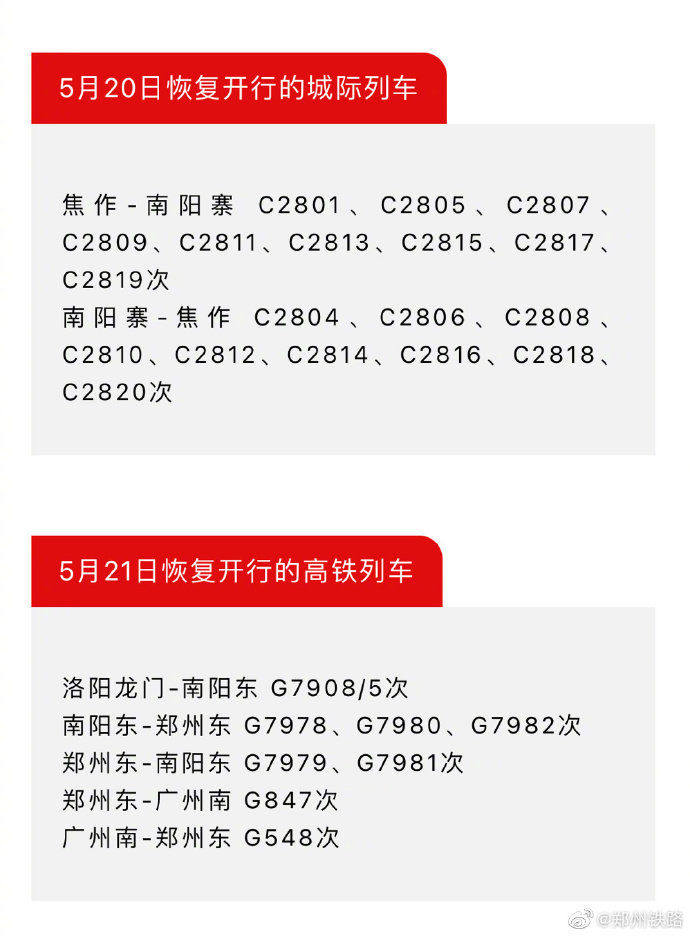 按照客运计划,自5月20日起,中国铁路郑州局集团有限公司管内的部分高铁列车、城际列车将恢复开行。具体车次如下: