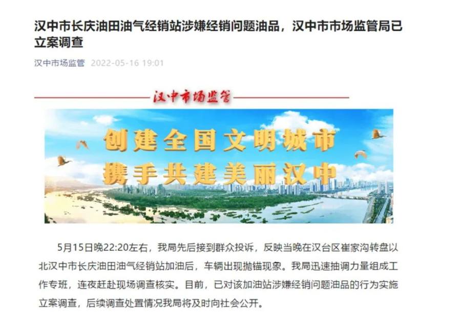 5月16日,汉中市市场监督管理局发布通报称,5月15日22:20左右,该局先后接到群众投诉,反映当晚在汉台区崔家沟转盘以北汉中市长庆油田油气经销站加油后,车辆出现抛锚现象。该局迅速抽调力量组成工作专班,连夜赶赴现场调查核实。目前,已对该加油站涉嫌经销问题油品的行为实施立案调查,后续调查处置情况将及时向社会公开。