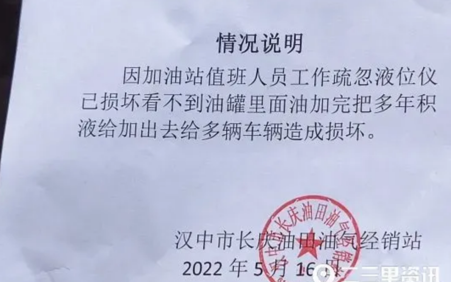 华商报报道,该加油站5月16日提供了一份情况说明,称“因加油站值班人员工作疏忽液位仪已损坏,看不到油罐里面油加完把多年积液给加出去,给多辆车辆造成损坏。”