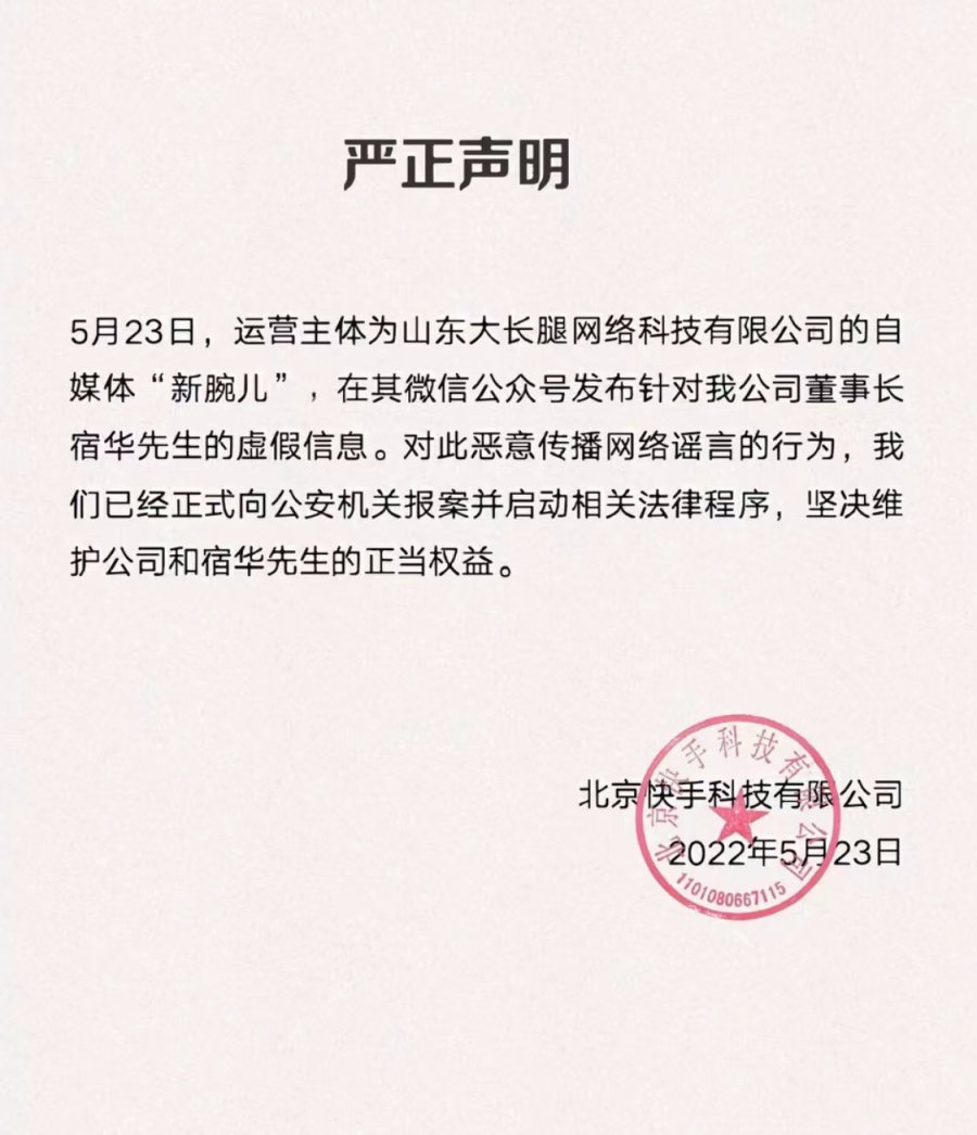23日晚间,快手就此事回复红星资本局称,自媒体“新腕儿”发布有关公司董事长宿华的消息为虚假信息,公司已经向公安机关报案并启动相关法律程序,坚决维护公司和宿华先生的正当权益。