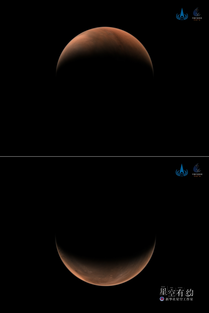 2021年3月26日,国家航天局发布2幅由我国首次火星探测任务天问一号探测器拍摄的南、北半球火星侧身影像。这是一张拼版照片,上图为:北半球上方火星影像;下图为:南半球上方火星影像。(新华社发)