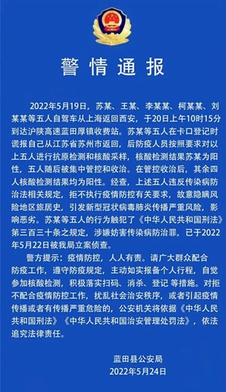 5月24 日,陕西西安蓝田县公安局发布通报,苏某等5人自驾车从上海返回西安,在卡口登记时谎报自己从江苏省苏州市返回,在管控收治后,5人核酸检测结果均为阳性。因违反传染病防治法相关规定,拒不执行疫情防控有关要求,故意隐瞒风险地区旅居史,引发新型冠状病毒肺炎传播严重风险,上述5人已被警方立案侦查。(5月24日澎湃新闻)