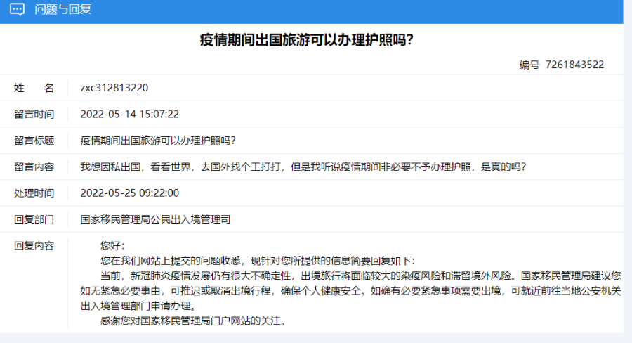 5月14日,有网民留言咨询:想因私出国,看看世界,去国外找个工打打,但是听说疫情期间非必要不予办理护照,是真的吗?