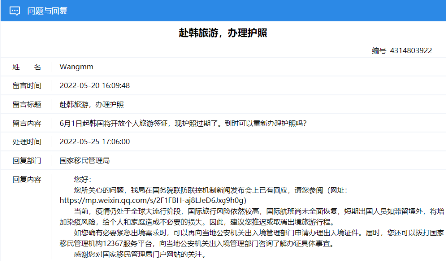 5月20日,有网民留言咨询:6月1日起韩国将开放个人旅游签证,现护照过期了,可以重新办理护照吗?