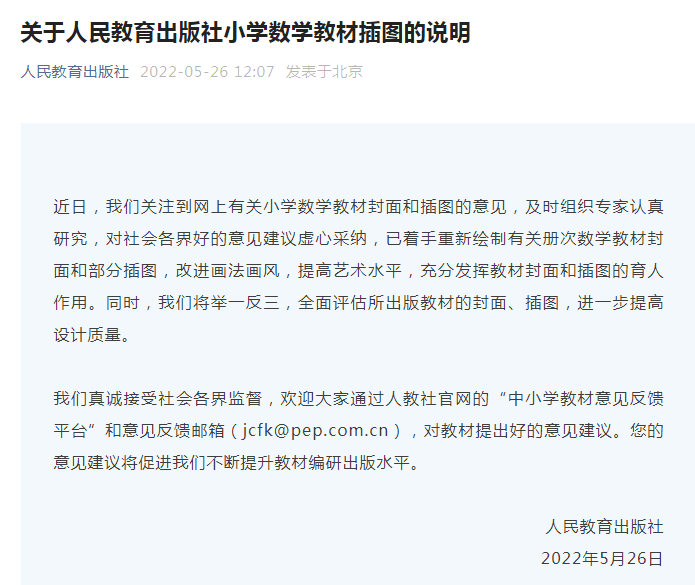近日,我们关注到网上有关小学数学教材封面和插图的意见,及时组织专家认真研究,对社会各界好的意见建议虚心采纳,已着手重新绘制有关册次数学教材封面和部分插图,改进画法画风,提高艺术水平,充分发挥教材封面和插图的育人作用。