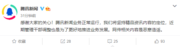 5月26日,@腾讯新闻 发文辟谣,表示腾讯新闻业务正常运行,网传相关内容是恶意造谣,近期管理干部调整也是为了更好地推进业务发展。