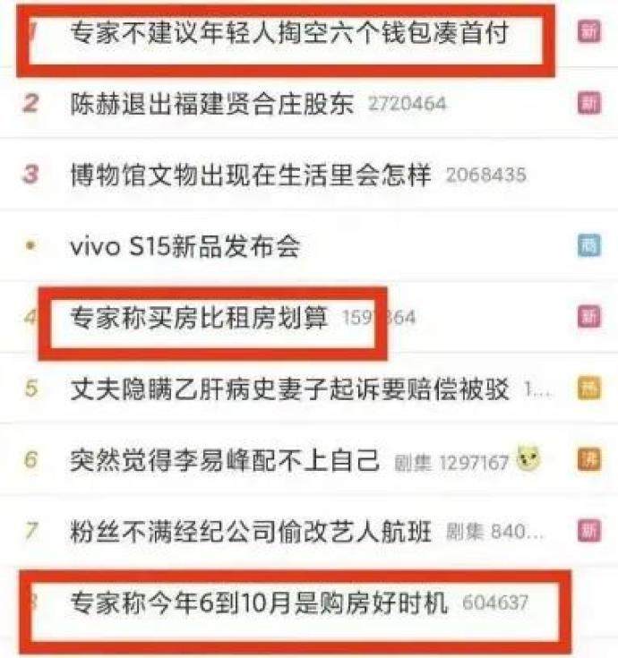 先是5月19日,“专家不建议年轻人掏空六个钱包凑首付”“专家称买房比租房划算”“专家称今年6到10月是购房好时机”,这三个与买房有关的话题同时上了热搜,随后,“建议专家不要建议”冲到热搜第一。