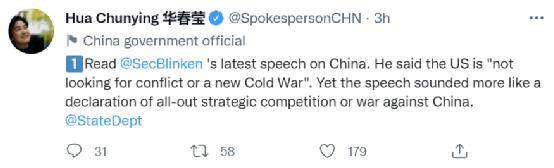 北京时间5月27日下午5时42分,华春莹在推特上发布了第一组回击布林肯的推文。她写道:“读读布林肯国务卿最新涉华演讲。他说美国‘不是在寻求冲突或新冷战’。然而,这番讲话听起来更像是针对中国发起的全面战略竞争或战争的宣言。”