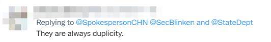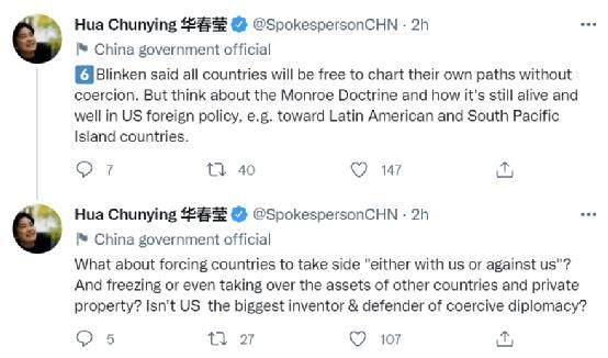 在最后一组推文中,华春莹写道:“布林肯国务卿表示,美国将与中国进行建设性接触,这两个伟大的国家可以和平共处。嗯,我们以前听过这些话,并随时准备朝着合作共赢的方向努力。”她表示,“‘听其言观其行’,美方能否兑现承诺,我们将拭目以待。”