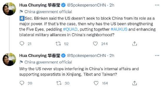 华春莹连发11组推文,点对点驳斥布林肯对华政策演讲