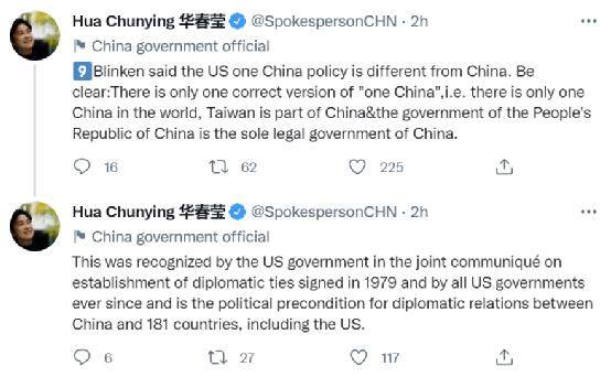 在第九组推文中,华春莹谈及美涉台政策:“布林肯表示,美国的一个中国政策与中国的不同。请明确:‘一个中国’只有一个正确的版本,即世界上只有一个中国,台湾是中国的一部分,中华人民共和国政府是代表全中国的唯一合法政府。”华春莹强调,“这是美国政府在1979年签署的《中美建交联合公报》中以及此后所有美国政府所承认的,也是中国与包括美国在内的181个国家建立外交关系的政治前提”。
