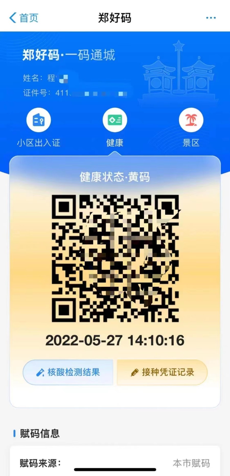 27日凌晨1时,从许昌市驾车来到郑州市经开区家中收拾完物品后,11时拿着核酸检测证明,准备从东三环南收费站上高速返回许昌时,发现自己的健康码变黄了。