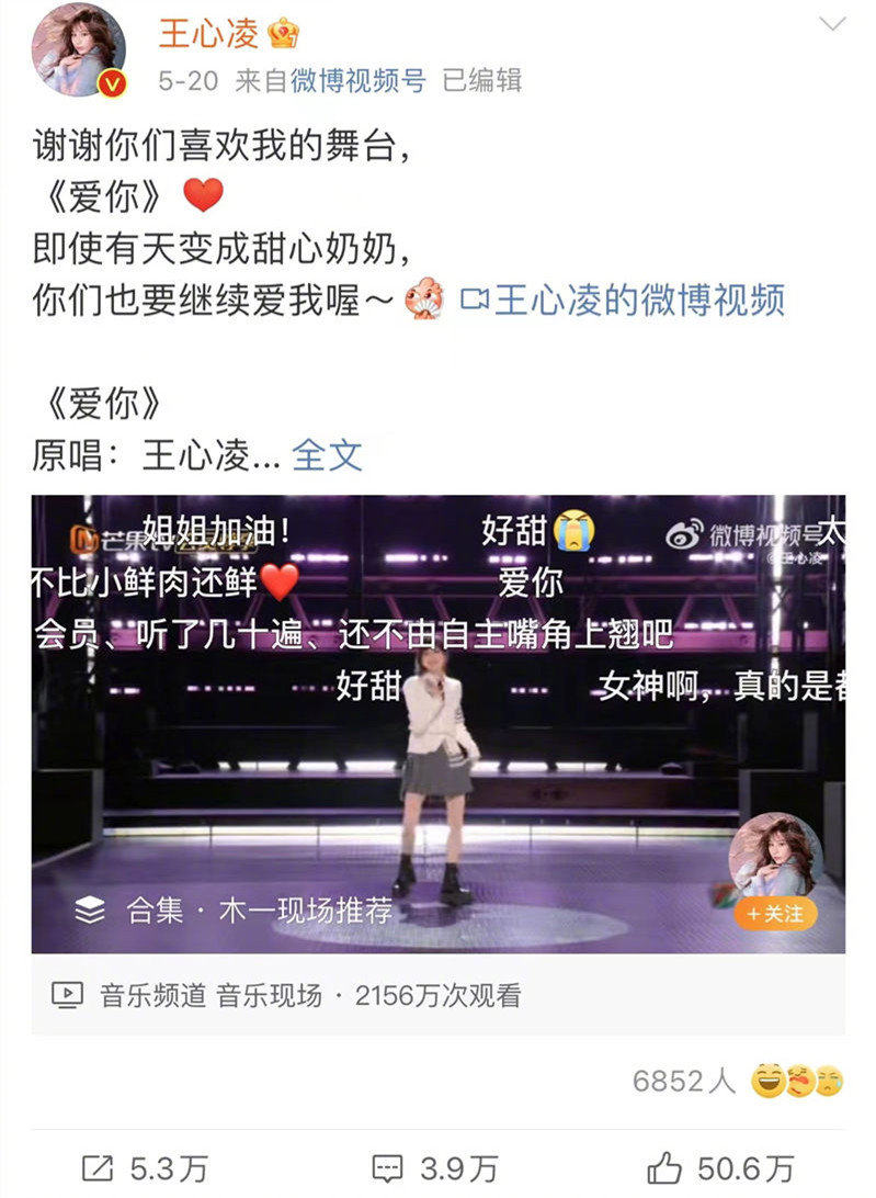 5月20日当天,王心凌在微博上写道:“谢谢你们喜欢我的舞台,《爱你》,即使有天变成甜心奶奶,你们也要继续爱我喔~”