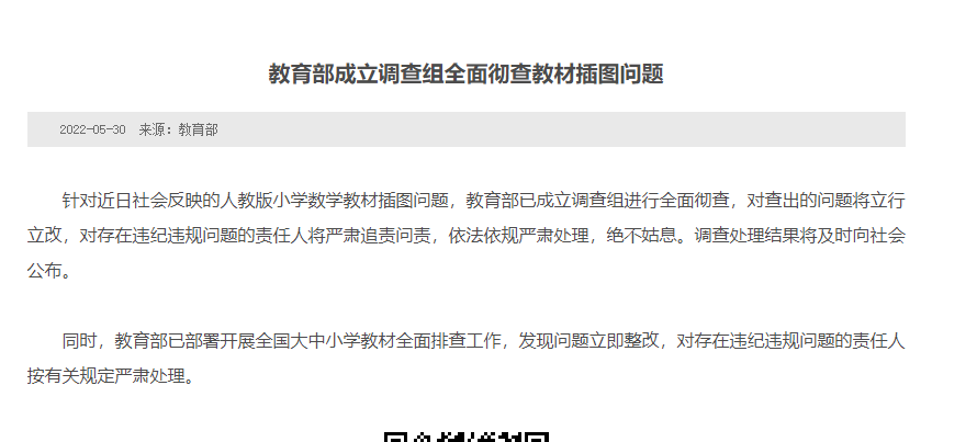 同时,教育部已部署开展全国大中小学教材全面排查工作,发现问题立即整改,对存在违纪违规问题的责任人按有关规定严肃处理。