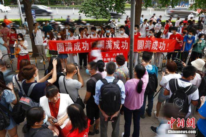 资料图:2021年6月7日,北京人大附中考点外,送考同学为考生拉横幅加油。当日,中国2021年高考正式拉开大幕,1078万名考生赶赴考场。 中新社记者 富田 摄