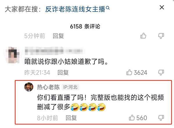 记者发现,6月1日凌晨,老陈在对网友的回复中表示:“你们看直播了吗!完整版也能找的 这个视频删减了很多。”