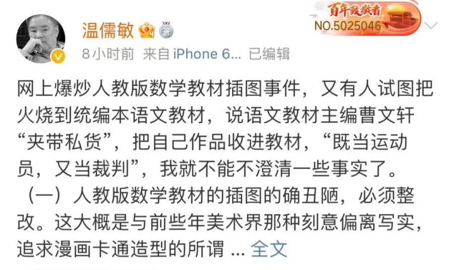 “教材是公共知识产品,牵涉到立德树人,非常重要,广大群众高度关注,多有批评,完全可以理解。我们作为编者应真心诚意听取各种批评意见,又努力做到头脑清醒,不被网络戾气所裹挟,不断完善教材。”温儒敏在微博中写道。