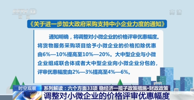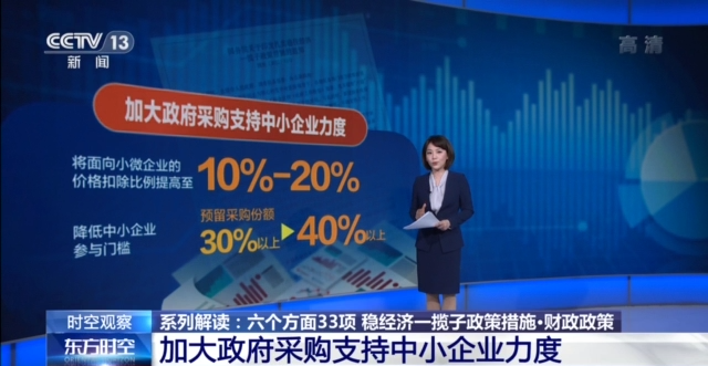 此次的财政政策7项措施中还提出,要加大政府采购支持中小企业力度,将面向小微企业的价格扣除比例提高至10%—20%。同时,降低中小企业参与政府采购工程门槛,将预留采购份额由30%以上今年阶段性提高至40%以上。
