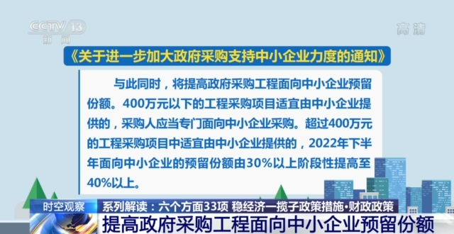 与此同时,将提高政府采购工程面向中小企业预留份额。400万元以下的工程采购项目适宜由中小企业提供的,采购人应当专门面向中小企业采购。超过400万元的工程采购项目中适宜由中小企业提供的,2022年下半年面向中小企业的预留份额由30%以上阶段性提高至40%以上。