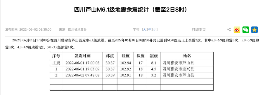 四川省地震台信息显示,截至2022年06月02日08时00分共记录到M3.0级及以上余震2次,其中6.0~6.9级地震0次,5.0~5.9级地震0次,4.0~4.9级地震1次,3.0~3.9级地震1次。