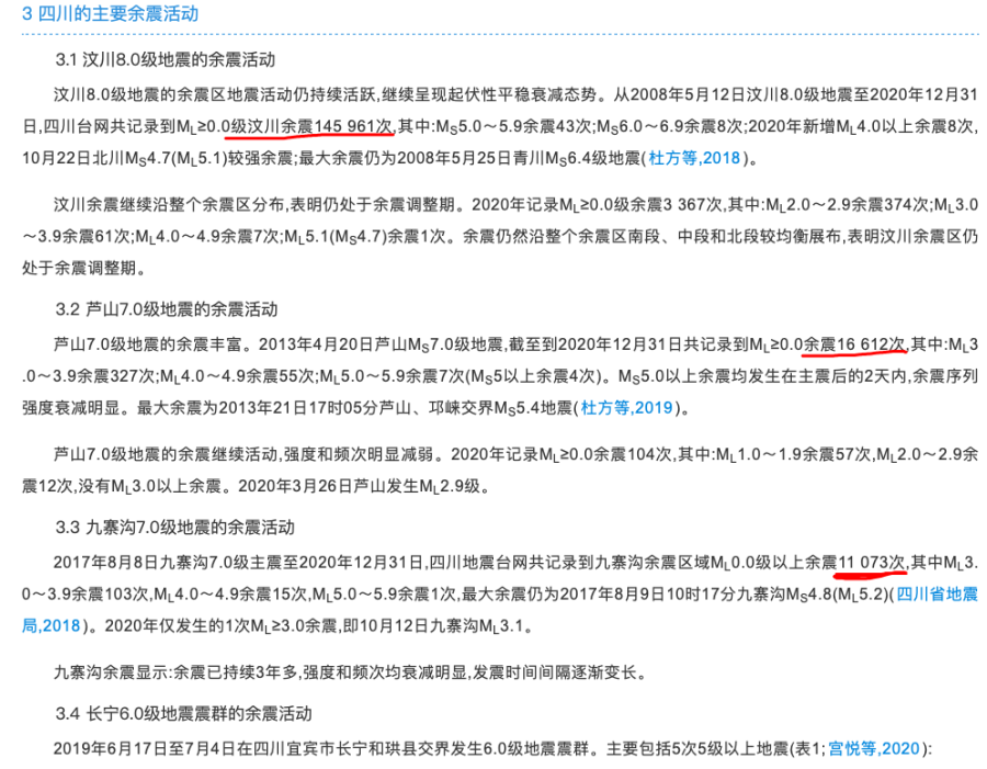 而据该篇内容显示,除芦山7.0级地震外,四川省内曾经发生过的汶川8.0级地震、九寨沟7.0级地震等,在震后的几年至十几年间,余震仍频发。