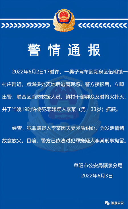 2022年6月2日17时许,一男子驾车到颍泉区伍明镇一村庄附近,点燃多处麦地后逃离现场。警方接报后,立即出警,联合区消防救援人员、镇村干部群众及时将火扑灭,并于当晚19时许将犯罪嫌疑人李某(男,33岁)抓获。