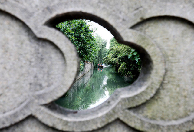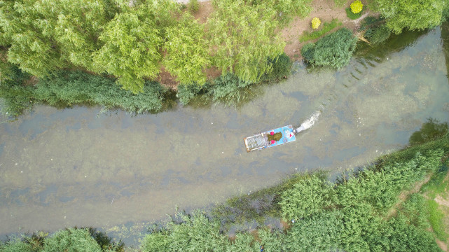 6月4日,环卫工人在江苏苏州吉庆河上进行河面清洁作业。新华社发(杭兴微 摄)