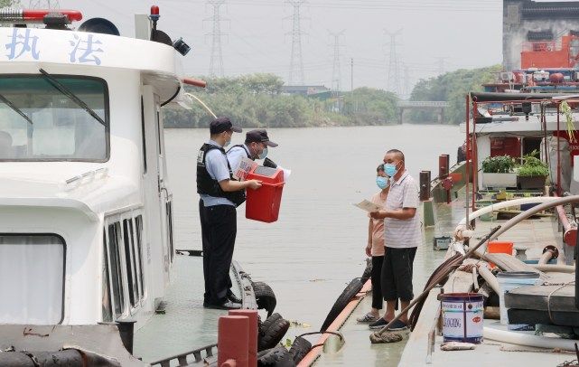 6月4日,浙江省湖州市德清县运河生态联勤警务站民警向船员们讲解船舶垃圾分类知识。新华社发(谢尚国 摄)