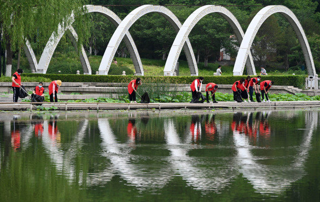 6月4日,河北省邯郸市丛台区柳林桥街道春厂社区的志愿者在龙湖公园捡拾垃圾。新华社发(郝群英 摄)