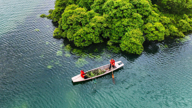6月4日,志愿者在湖南省常宁市洋泉水库清理水面漂浮物(无人机照片)。新华社发(周秀鱼春 摄)