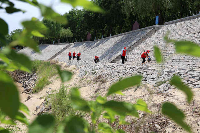 6月4日,山东省滨州市博兴县的青年志愿者们在黄河边捡拾垃圾。新华社发(初宝瑞 摄)