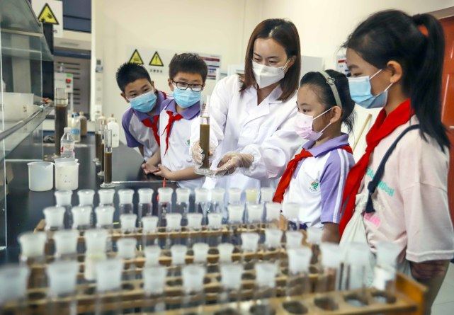 6月4日,儿童在河北省遵化市污水处理厂化验室参观污水检验流程。新华社发(刘满仓 摄)
