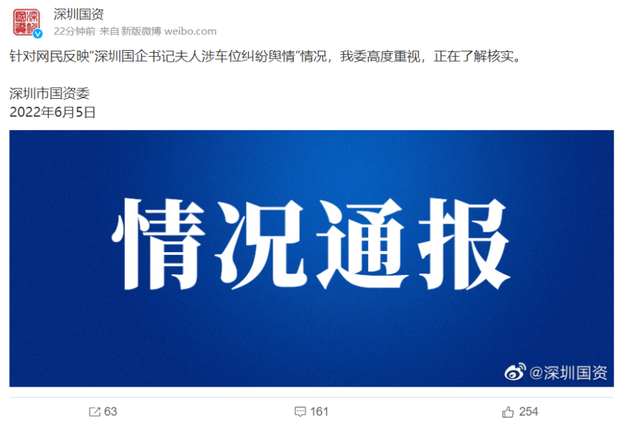 6月5日晚,深圳国资委发布情况通报:
