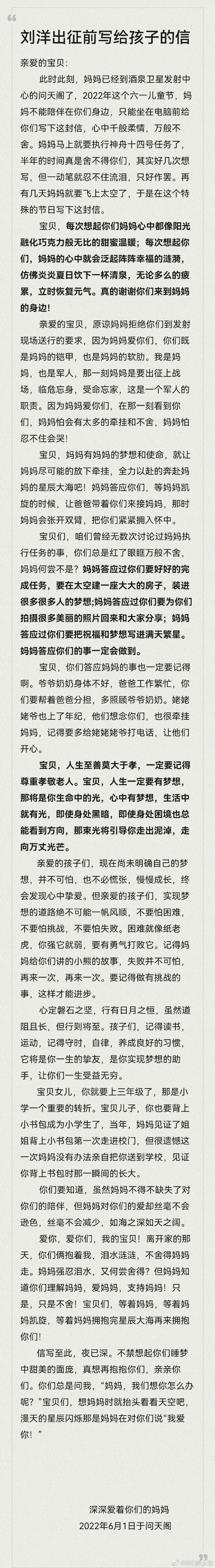 刘洋出征前写给孩子的信,说出拒绝儿女送行原因