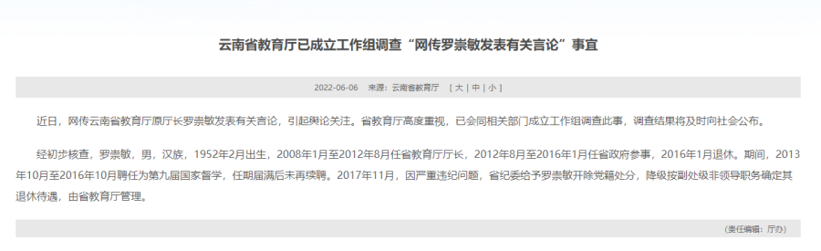 云南省教育厅:已成立工作组调查“网传罗崇敏发表有关言论”